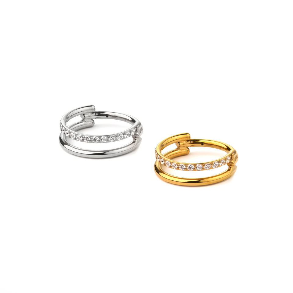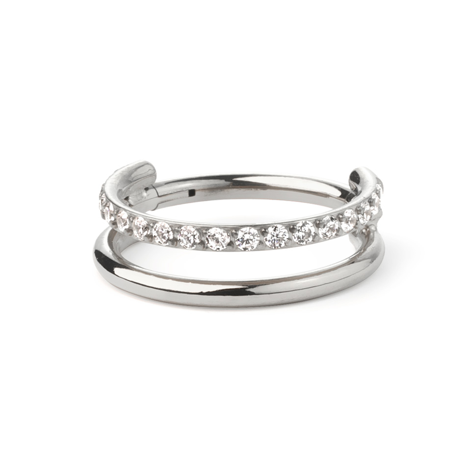Ez a szokatlan darab két karikából áll, az egyiken egy kősor kapott helyet. A két karika egy szárban fut össze, ezt helyezzük a piercingbe. Titánból készült, hipoallergén és időtálló. Elérhető különböző átmérőkben, illetve arany és ezüst színben. Többféle fülpiercingben hordható, bármelyikben is hordod, mesés kiegészítője lesz fülednek.