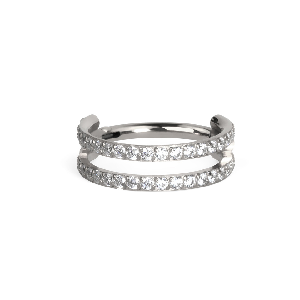 Ez a mesés dupla karika két, tiszta cirkónia kövekkel kirakott félkörrel büszkélkedhet. Ha szereted a csillogást, ragyogást, miért ne dupláznál?