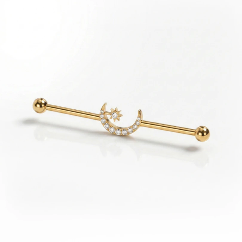 A titán industrial barbell, középen elhelyezett félholddal és csillaggal, egyértelmű fókuszpontot ad az industrial piercingednek. A félhold a közepén ül, apró kövekkel díszítve, míg egy pici csillag mellette pihen, kontrasztot adva anélkül, hogy a dizájn túlzsúfoltnak hatna. Az elrendezés letisztultan tartja a barbellt, a részletek pont annyit tesznek hozzá, amennyi kell. Arany- és ezüstszínekben kapható.