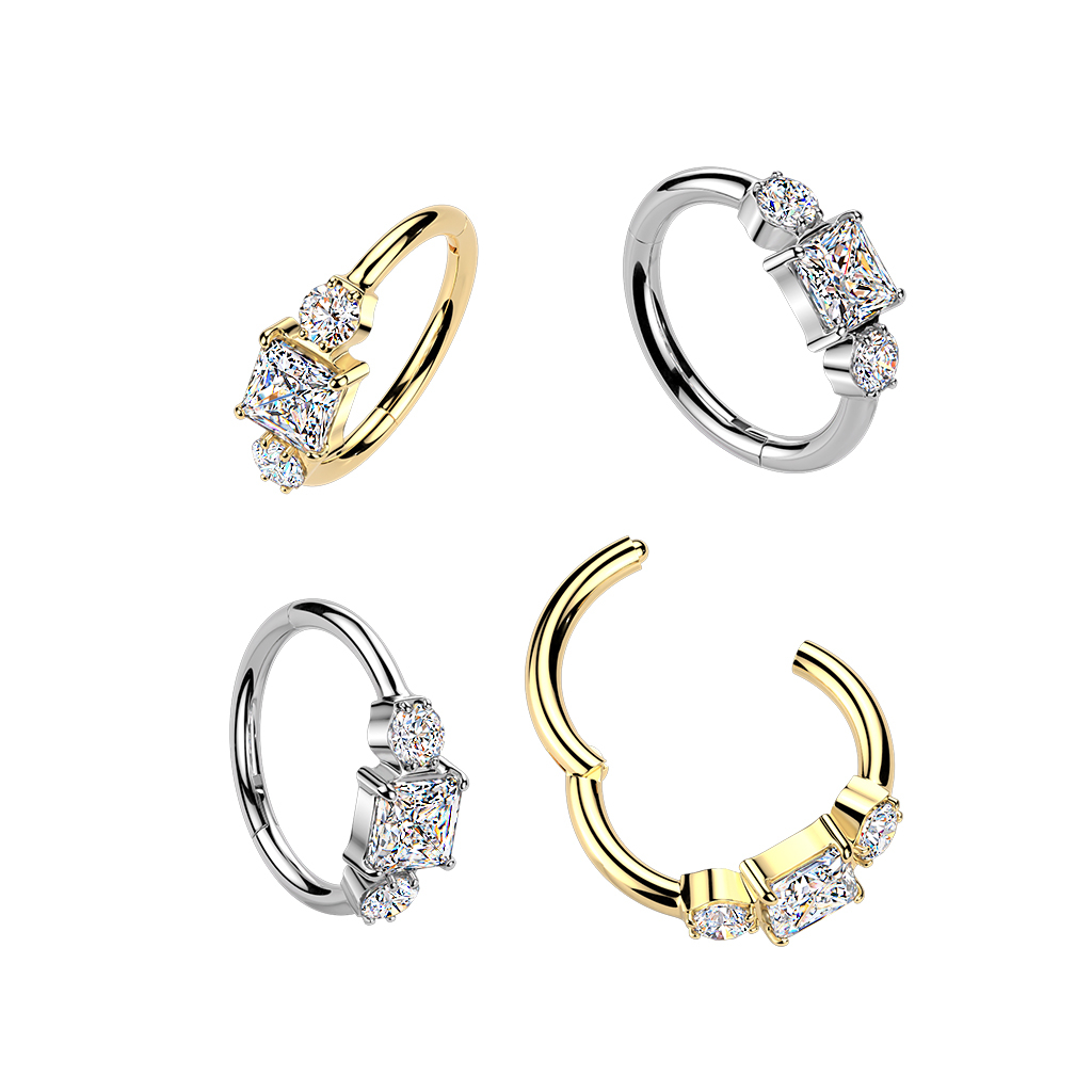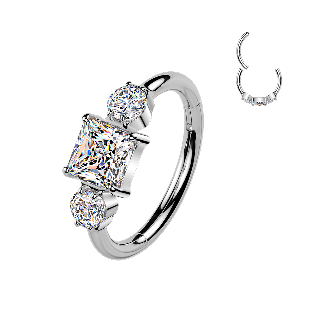 Három kő, nagyszerű stílus. Ez a Bodymod Premium titán kapcsos karika három cirkónia kővel megadja piercingednek a szükséges csillogást. Elég visszafogott a mindennapi viselethez, de elég ragyogó ahhoz, hogy magára vonzza a tekintetet.