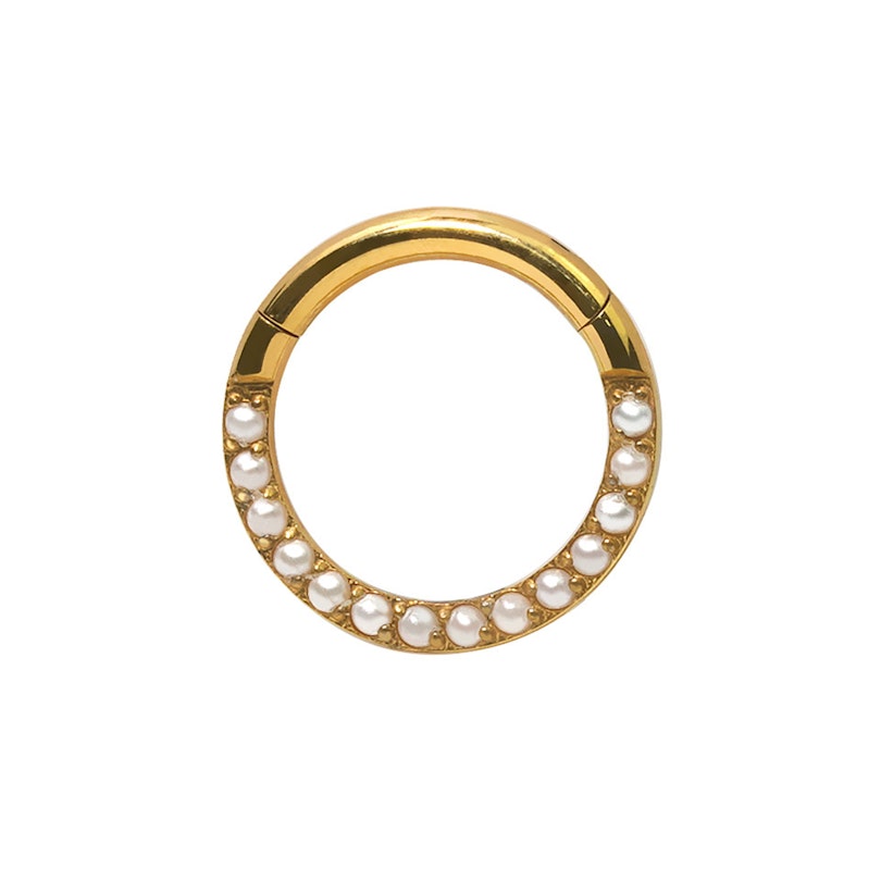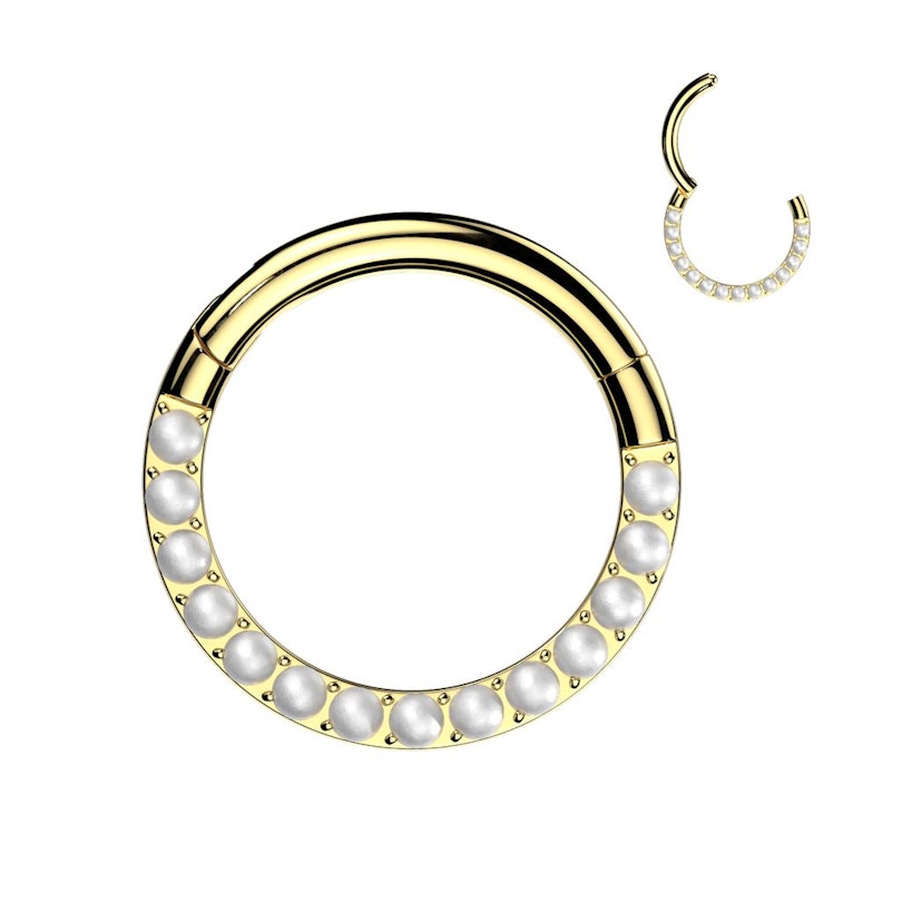 Ez a kapcsos titán karika előre néző, szintetikus gyöngyökkel van kirakva, ezért tökéletes septum vagy daith piercingekhez.