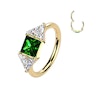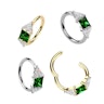 Ez az a frissítés, amiről a piercingjeid nem is tudták, hogy szükségük van rá. Ez a Bodymod Premium titán karika a közepén elhelyezkedő, szögletesre csiszolt zöld kővel igazán merész darab. A központi követ két éles, fehér háromszög alakú kő keretezi, amelyek minden szögből elkapják a fényt. Képzeld el: letisztult geometria egy üdítő színfolttal.