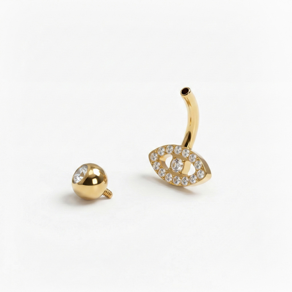 A titán köldökpiercing gonosz szem motívummal szimbolikus csavart ad a köldökpiercingednek. A szem a közepén ül, apró kövekkel körülvéve, hogy szépen kirajzolódjon a forma. Visszafogottan kifejező, könnyen hordható, lazább napokon ugyanúgy működik, mint amikor kicsit feldobod a szetted. Arany és ezüst színben kapható.