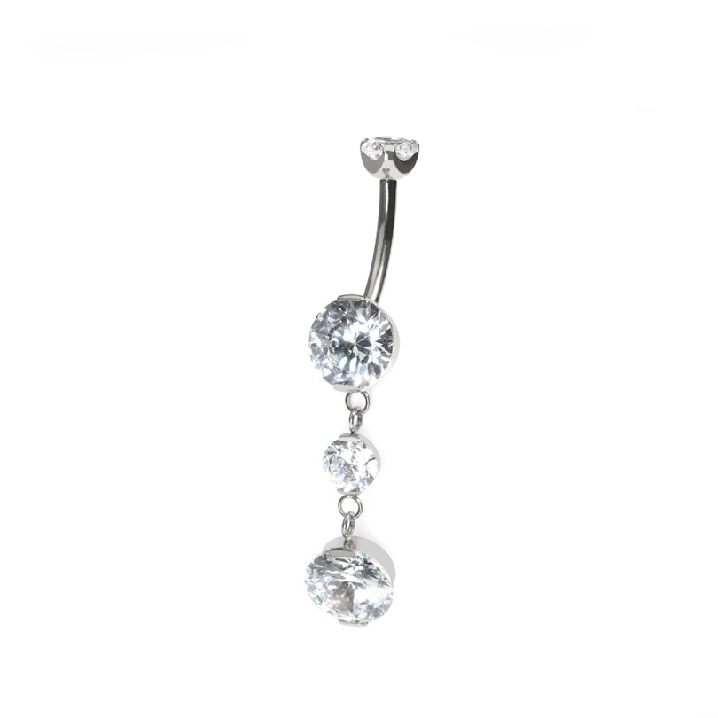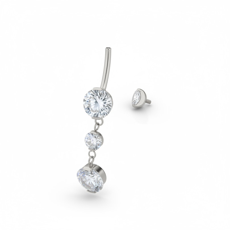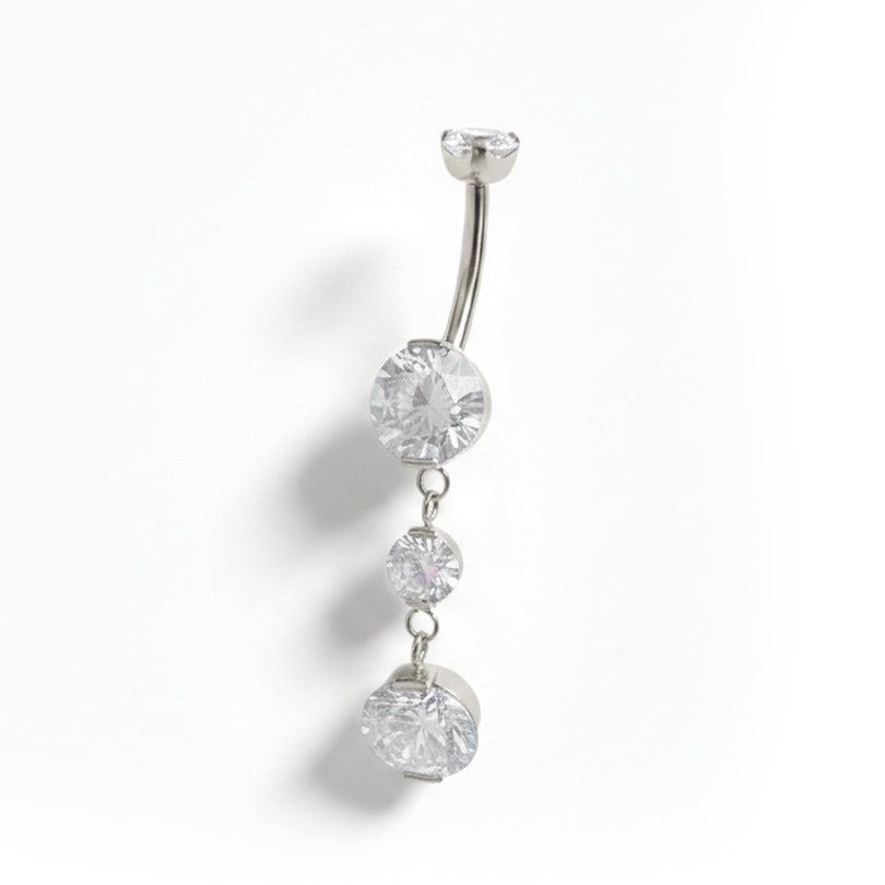 Ez a káprázatos titán köldökkarika medállal 4 darab tokos foglalatba ágyazott kővel van díszítve, amelyek közül egy-egy a golyókban, kettő pedig a medálon található. Az ékszer alsó részének (az alsó gömb tetejétől a medál aljáig) teljes hossza kicsit több mint 3 cm. Az ékszer belső menetes zárral rendelkezik, vagyis csak a sima szárat kell behelyezni a piercinglyukba, majd a felső részt rácsavarva lehet zárni. A titán amellett, hogy hipoallergén, vízálló is, így ez az ékszer tökéletes a medencézős napokra.