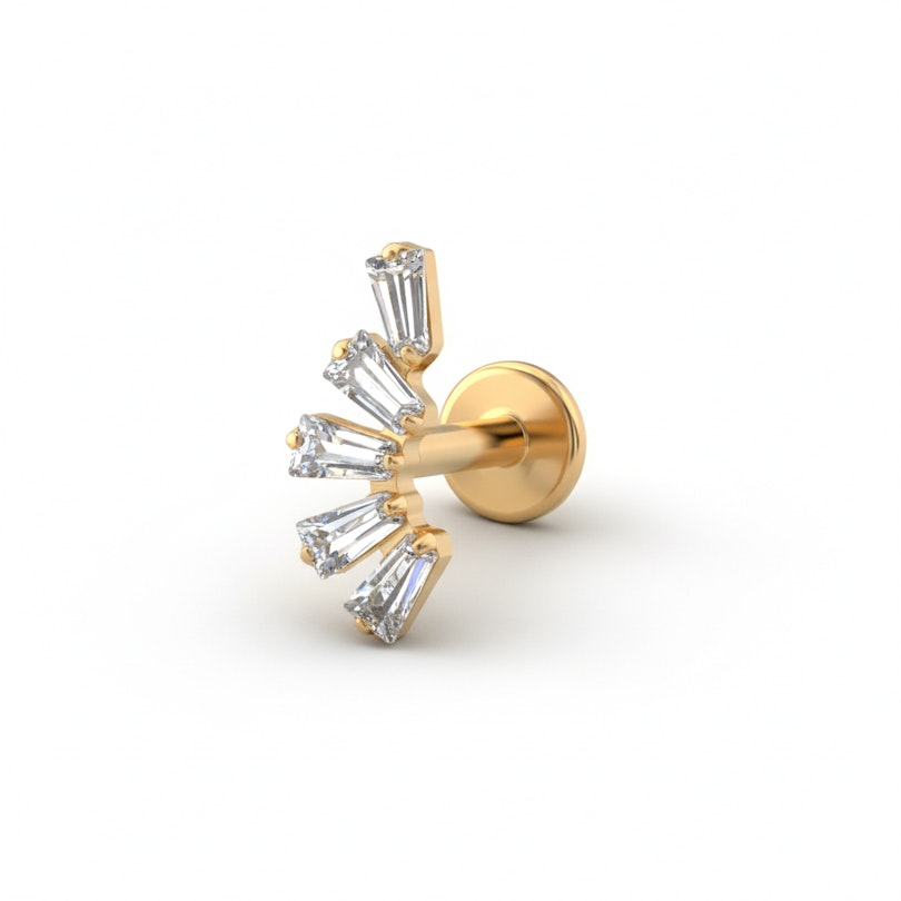 A baguette csiszolású kövekkel díszített titán labret azokhoz a pillanatokhoz készült, amikor a letisztultság és a forma számít. A baguette csiszolású kövek tisztán és élesen sorakoznak fel a füleden, így kiegyensúlyozott megjelenést kölcsönözve.