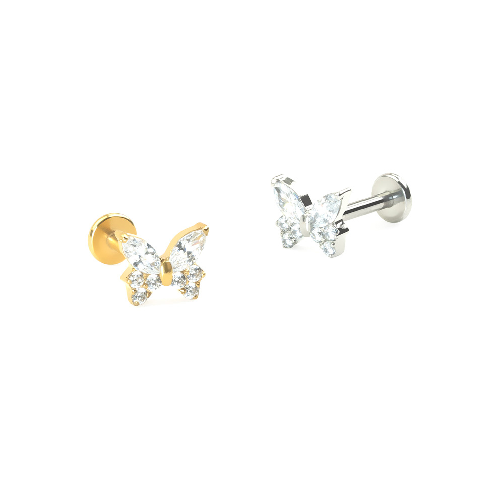 Ez a szép labret 8 ragyogó cirkónia kővel van díszítve. Minden egyes szárnyon található egy marquise csiszolású kő, amely a szárny felső részét adja, illetve három apró, kör alakú kő, ezek adják a szárny alsó részét. Az ékszer legszélesebb pontjánál 7 mm-es, magassága pedig 5,5 mm, így többféle fülpiercingbe is illik.