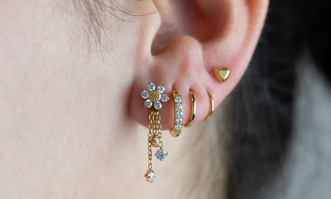 Elhelyezkedés: Tragus, Fülcimpa, Helix, Conch
