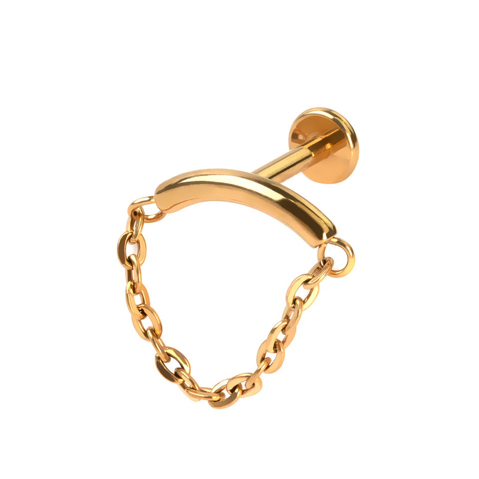 Ez a labret egy hajlított rúddal rendelkezik, amely tökéletesen ilelszkedik a füledbe, ha azt a helix piercingedben viseled. Fülcimpában is remekül mutat. A labretet egy csinos lánc díszíti, amely a két végéről lóg.