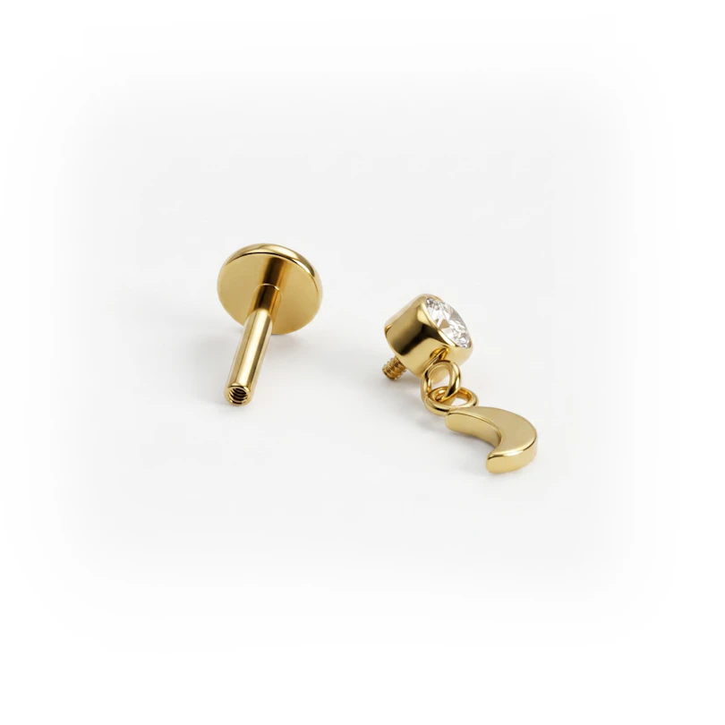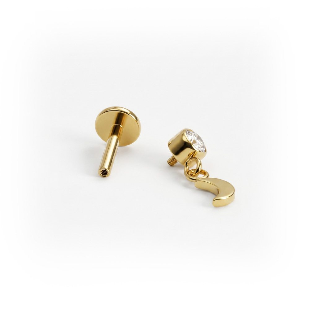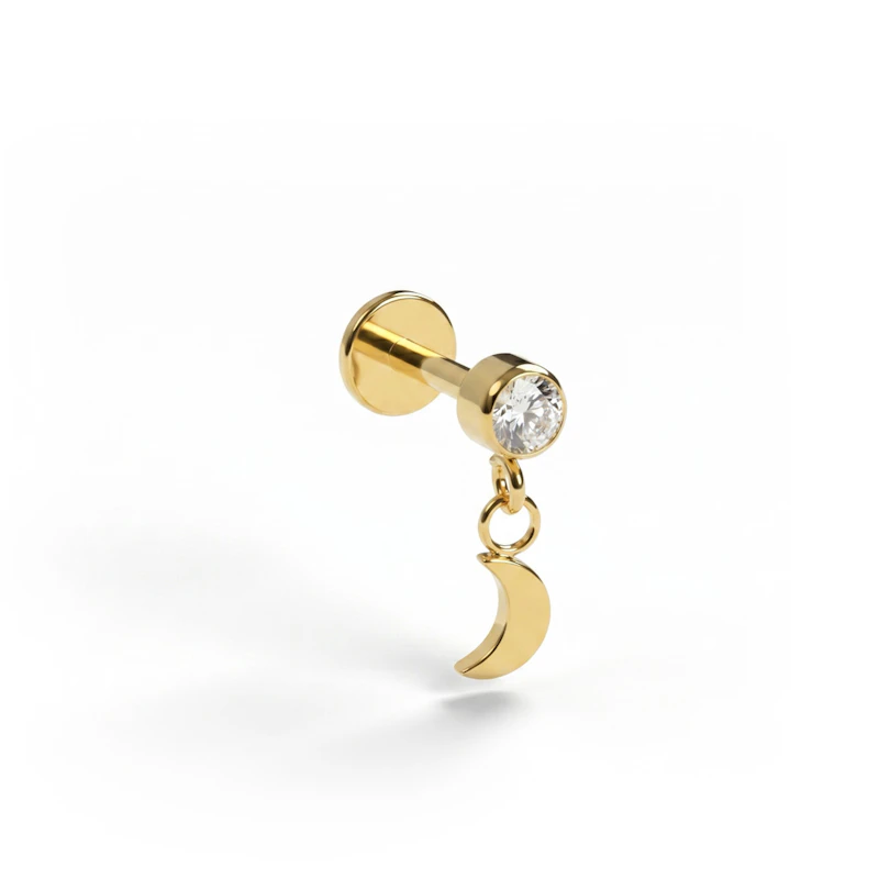 A titán labret holdmedállal letisztult hatást kelt: felül egy tokos foglalatú kő, alatta egy apró holdalakú medál ad finom mozgást az összhatásnak. Önmagában is könnyedén viselhető, de egy fülékszer-összeállítás részeként is működik. Arany- és ezüstszínben kapható.