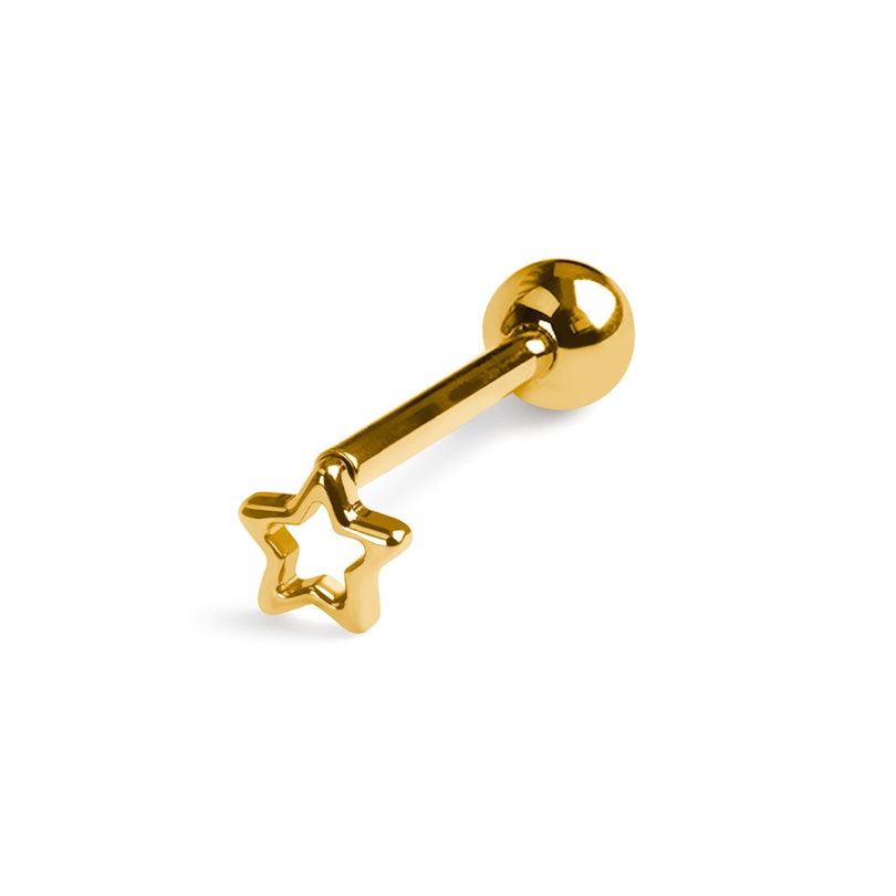 Ez a csillaggal díszített titán nyelvpiercing hipoallergén, így alkalmas érzékenybőrűek számára. Belső menetes kialakítású, ami azt jelenti, hogy a sima felületű szárat kell a piercingbe helyezni, majd a helyére csavarni.