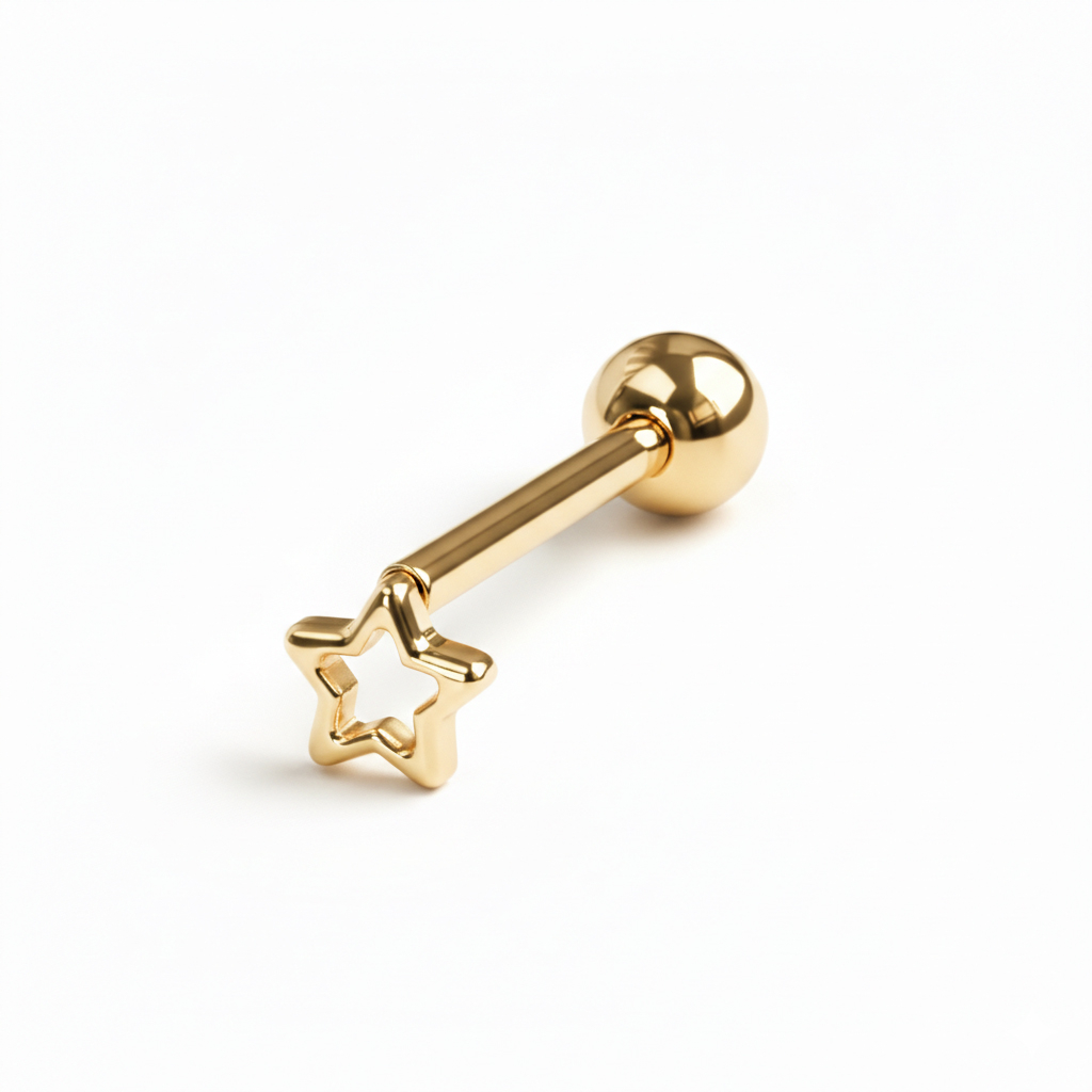 Ez a csillaggal díszített titán nyelvpiercing hipoallergén, így alkalmas érzékenybőrűek számára. Belső menetes kialakítású, ami azt jelenti, hogy a sima felületű szárat kell a piercingbe helyezni, majd a helyére csavarni.