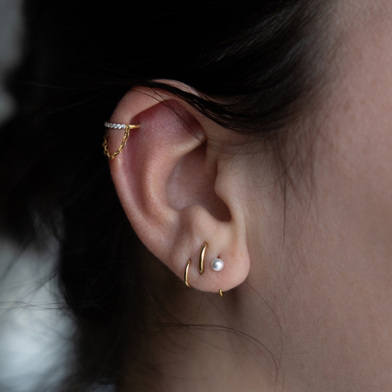 A gyöngyös titán nyitott karika könnyű frissítést hoz a fülékszereidnek. Egy gyöngy található az ív végén, amely lágyabb, természetesebb hatást kölcsönöz túlzások nélkül. Viseléséhez vezesd át a nyitott végét a fülcimpádon, majd forgasd előre, amíg kényelmesen nem illeszkedik. Viselheted alsó vagy felső fülcimpán is, és bármikor kombinálhatod más fülékszerekkel, ha változatossághoz van kedved.