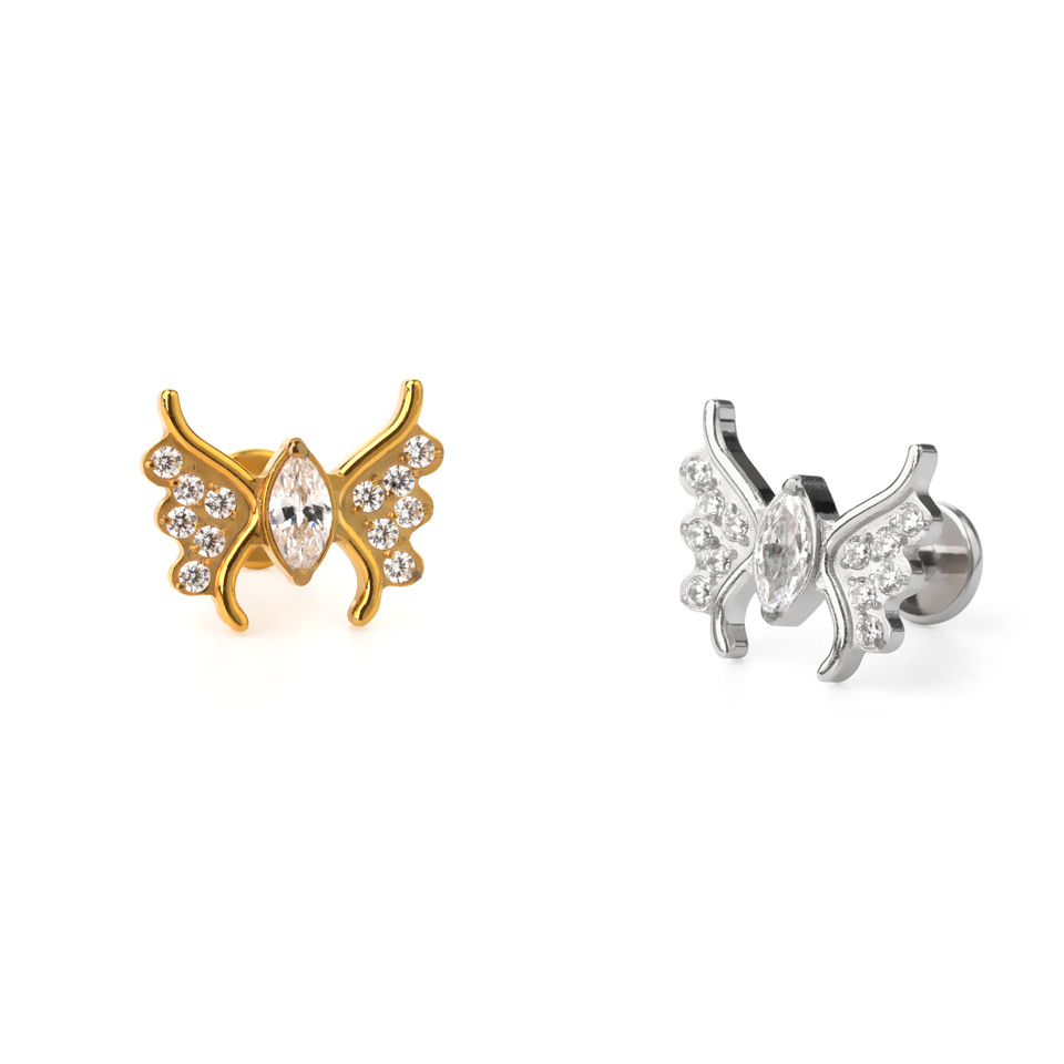 Ez az elbűvölően részletgazdag labret egy gyönyörű pillangó formát kapott. A pillangó testét egy ovális cirkónia kő adja, a szárnyak pedig 6 apró kővel lettek kirakva. Az ékszer titánból készült, így tartós és hipoallergén. A belső menetes kialakítás miatt egyszerű és kényelmes behelyezni a piercingbe. Ez a pillangó ragyogó kiegészítője lesz fülkombinációdnak.