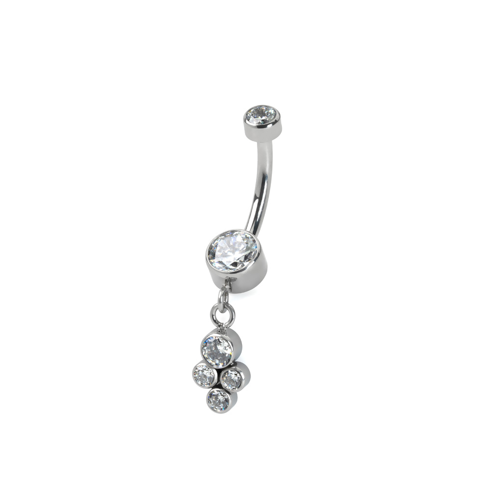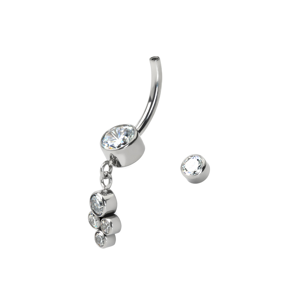 Titánból készült köldökkarika lelógó, lünetta-keretes kövekkel