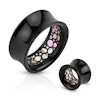 Ez a gyönyörű és egyszerűen használható alagút fekete akrilból készült, a belseje csodaszép díszítést kapott. Nyereg alakja miatt tökéletesen illeszkedik a füledbe. Különböző méretekben, 8 és 25 mm közötti kivitelben kapható.