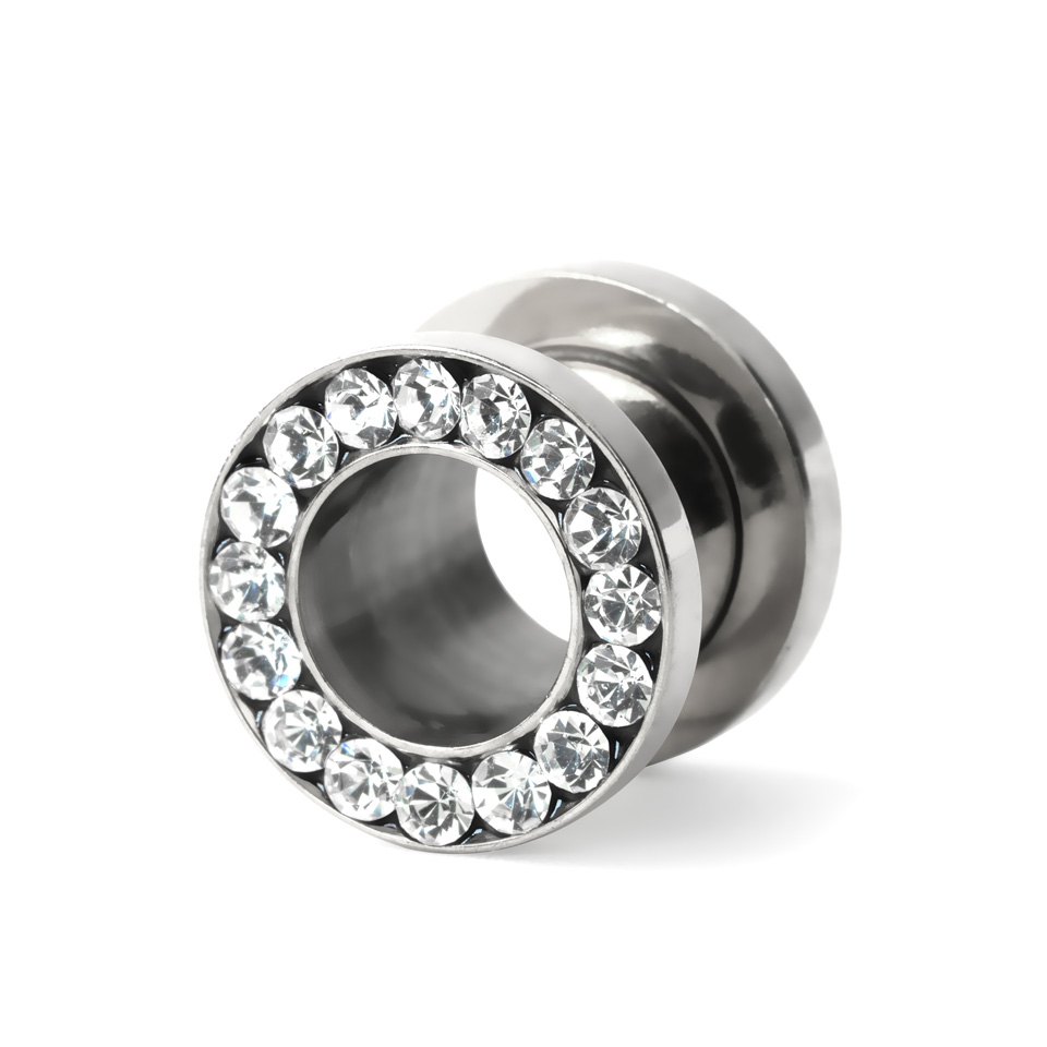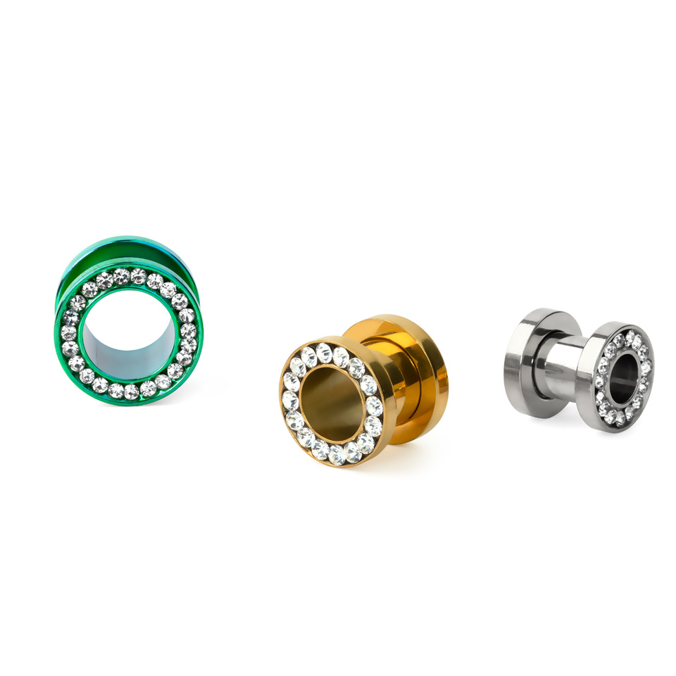 Szép és klasszikus tunnel, mely orvosi acélból készült, és több méretben és szín kombinációban kapható. Az ékszerek szegélye csillogó kövekkel van kirakva. Itt mindenki talál valami ízlésének és méretének megfelelőt.