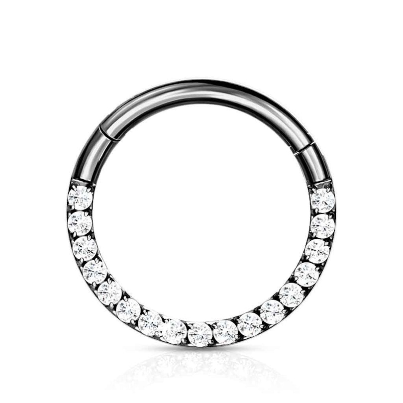Az ékszer elülső részét egy sor ragyogó kő díszíti. Erre oda kell figyelned, amikor megtervezed, melyik piercingedben szeretnéd hordani. Például a kövek elhelyezkedése ideálissá teszi septum vagy daith piercingekhez, de pl. orrcimpa piercingnek lehet jobb valami mást választani.