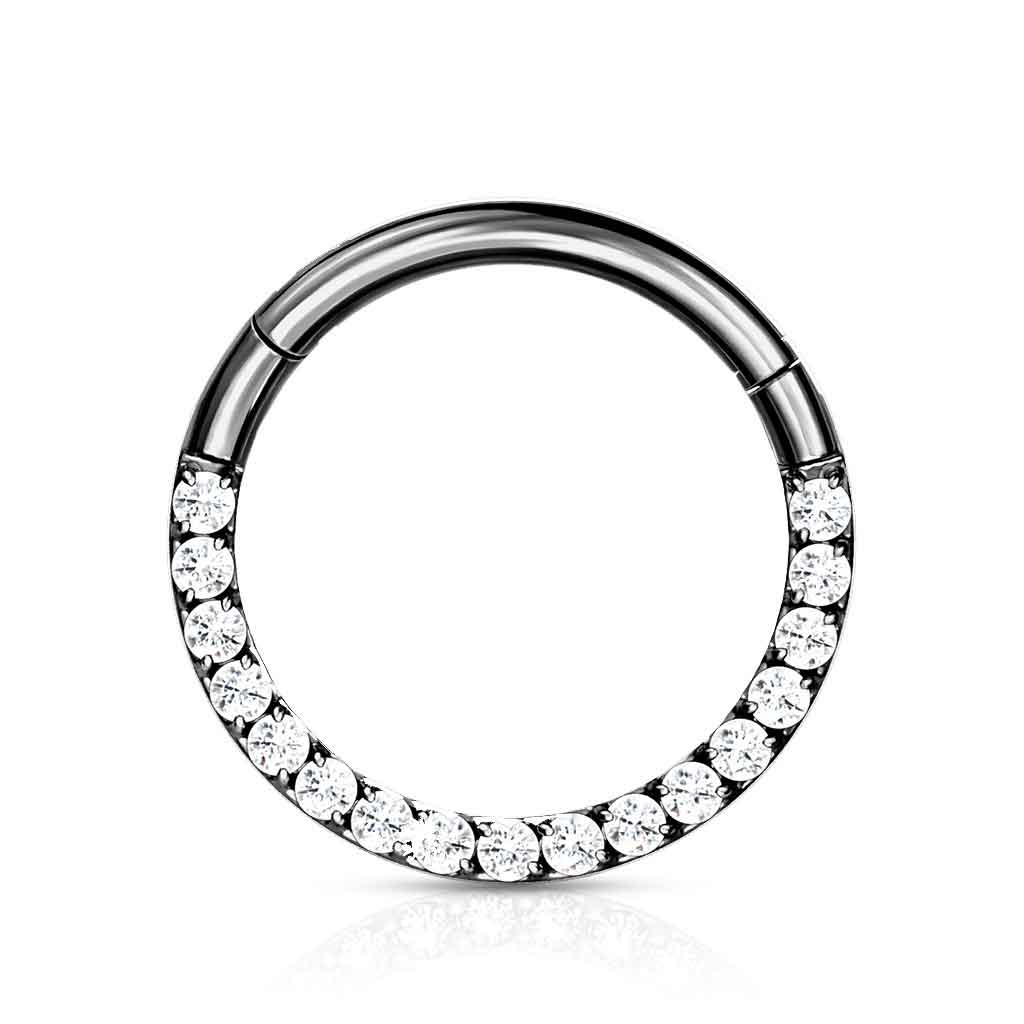 Az ékszer elülső részét egy sor ragyogó kő díszíti. Erre oda kell figyelned, amikor megtervezed, melyik piercingedben szeretnéd hordani. Például a kövek elhelyezkedése ideálissá teszi septum vagy daith piercingekhez, de pl. orrcimpa piercingnek lehet jobb valami mást választani.