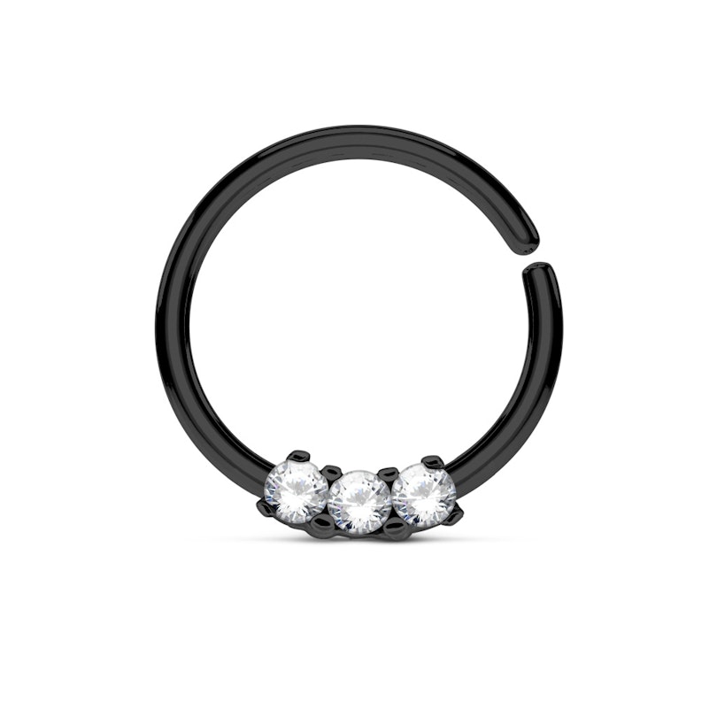 A legtöbb septum piercing nagy és mutatós; kevés olyan modell van, amely csak egy sima karikából áll. Valamint abban az esetben, ha köves berakással is rendelkezik az ékszer, akkor még nagyobb és szembetűnőbb lehet. Ha szeretnél egy diszkrét és elegáns megjelenést, arra kérünk vess egy pillantást erre a gyönyörű septum ékszerre, melyet három apró kő is díszít.