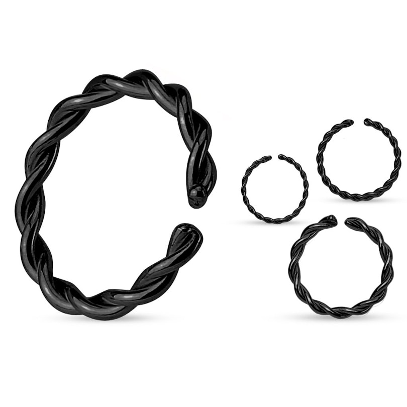 Itt láthatod népszerű végtelen karikánk egy újabb változatát. Normál végtelen karikánk egy darab fémből áll, amelynek végei összeérnek. Ez a végtelen karika viszont két darab fémből készült, melyek először összecsavartak, majd karikává formáztak. Az ékszer dizájnja szinte fonott hatást kelt. A karika végei kis heggesztést kaptak, melyet végül lekerekítettek, egyrészt hogy megkíméljék a peircinget a felhelyezés során, másrészt hogy a két fémet egybe tartsa.