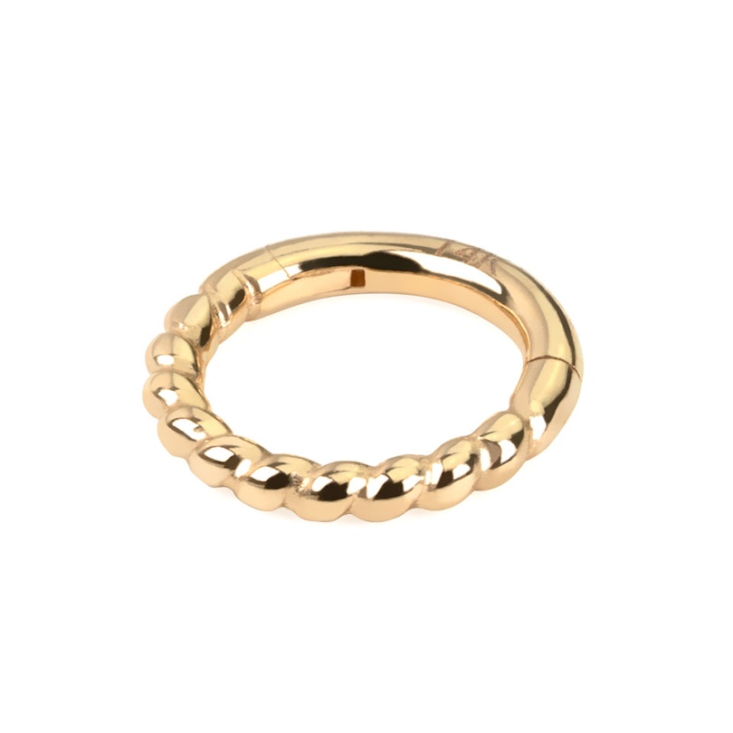 A képen látható ékszer zárt állapotban végtelen karikának tűnik, azonban van rajta egy kapocs, amelynek segítségével könnyen kinyitható. A karikát behelyezés után egyetlen kattintással vissza is zárhatod. Az ékszer 14 karátos aranyból készült, sárga és fehér arany színben kapható. A karika több méretben készült, rendelés előtt válaszd ki a megfelelőt.