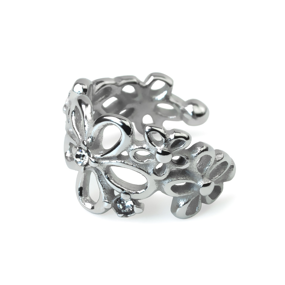 Ez a szép fülgyűrű egyszerű, virágos mintát kapott. A virágok, amelyek körül ölelik a füled, különböző méretűek. A nagyobb virágok közepei apró kövek, melyek finom ragyogást kölcsönöznek az ékszernek. A fülgyűrű apró golyókban végződik, ezért kényelmes a viselete. Rozsdamentes acélból készült, ezért ez a darab nem kopik, és nem színezi el a bőrt. Remek darab fülékszer-kombinációd kialakításához, plusz piercinglyuk nélkül.