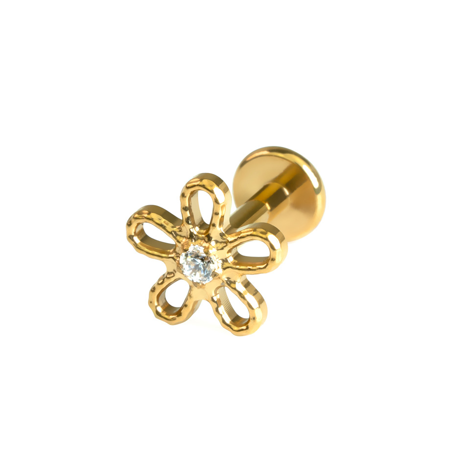 Elbűvölő margaréta formájú labretünk cirkónia kővel díszített, egy csipet csillogást kölcsönözve az ékszernek. A szára belső menetes, így egyszerű viselni — csak helyezd be a sima szárat a piercingedbe, majd csavard rá a felső részt az ékszer biztosításához. Hipoallergén titánból készült, ezért ideális érzékeny bőrűek számára. Elérhető arany- és ezüstszínben, illetve kiválaszthatod a piercingedhez megfelelő hosszúságot. Egészítsd ki megjelenésed egy aranyos margaréta mintával.